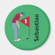 Golfista verde personalizado, vestindo um boné, camisa vermelha profunda e calças azuis, colocando uma bola de golfe em um ímã de buraco. Personalize o texto.