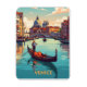 A gondolier steers a gondola with passengers through a Venetian canal, with ornate buildings and a bridge in the background.