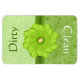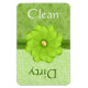 O imã da máquina de lavar louça na moda, em um padrão de espiral verde, e um padrão paisley, com o texto branco limpando, em uma metade do imã e o texto verde lendo sujo, na outra metade. Gráficos bonito de uma fita verde, ao longo do meio, são decorados com uma flor verde. Faz um presente de anfitriã excelente.