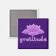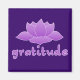 Adoramos esse design em um fundo roxo vibrante, mas você pode escolher qualquer cor que quiser (nos chaveiros, ímãs, botões, canecas e outros produtos). Um lótus suave e violeta forte, com a palavra "gratidão".