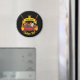 Churrasco sobre carvão inflamável, faixa de rolagem com texto personalizado sobre garfo e espátula.