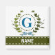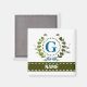 Uma grinalda de hera delicada com um arco azul listrado é sobreposta a um fundo branco fresco. O design apropriado para casamento apresenta o monograma "G" em azul. O ímã pode ser personalizado com qualquer nome sobre a faixa de fita verde. Dica de design: Para a fonte mostrada aqui, use letras maiúsculas para o nome.