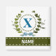 Uma delicada grinalda de hera com um laço listrado azul é sobreposta a um fundo branco fresco. O design apropriado para casamento apresenta o monograma "X" em azul. O ímã pode ser personalizado com qualquer nome sobre a faixa de fita verde. Dica de design: Para a fonte mostrada aqui, use letras maiúsculas para o nome.