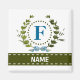 Uma grinalda de hera delicada com um laço listrado azul é sobreposta a um fundo branco fresco. O design apropriado para casamento apresenta o monograma "F" em azul. O ímã pode ser personalizado com qualquer nome sobre a faixa de fita verde. Dica de design: Para a fonte mostrada aqui, use letras maiúsculas para o nome.