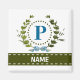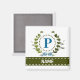 Uma grinalda delicada de hera com um laço azul listrado é sobreposta a um fundo branco fresco. O design apropriado para casamento apresenta o monograma "P" em azul. O ímã pode ser personalizado com qualquer nome sobre a faixa de fita verde. Dica de design: Para a fonte mostrada aqui, use letras maiúsculas para o nome.