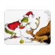 This hilarious illustration captures the precise moment the Grinch decides his dog needs an upgrade! The Grinch, dressed in his full, fuzzy Santa suit, is meticulously tying a single reindeer antler onto the head of his dog, Max, using a piece of string or yarn. Poor Max looks utterly resigned to his fate as the "reluctant reindeer." This fun, classic illustration perfectly highlights the absurd and mischievous planning behind the famous Christmas heist!