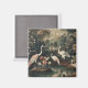 pintura botânica vintage de guindastes em pé num lago cercado por lindas flores exóticas com palácio ao fundo