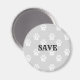 Peças brancas e bonitas sobre íman prateado redondo sobre fundo. O texto SAVE pode ser personalizado. Todos os animais precisam de vozes e corações gentis que se importam com eles. Vamos espalhou gentileza!