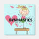 Uma menina cabeleira loira com camisa rosa e shorts verdes faz uma rotina no feixe de balanço cercado por corações cor-de-rosa para mostrar que ama ginástica em T-shirts, capuzes, canecas, ímanes, cartas, sacos de tote, adesivos e outras roupas e presentes de ginástica.