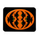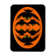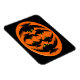Este incrível ímã apresenta um oval laranja com seis corvos. Cada corvo tem olhos amarelos com pupilas pretas e asas salientes. Os corvos voam em direção uns aos outros formando uma forma oval. O fundo é preto.