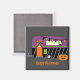 Recursos gráficos divertidos do Halloween retro style rv trailer em cores sazonais com abóbora, teia aranha e bandeiras de bunting sobre a janela, em cinzas de carvão com cobertura de texto personalizável laranja "Happy Halloween".
