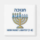 Celebrate the Festival of Lights with fun and learning! This educational sticker features a bright Hanukkah Menorah (Hanukkiah) with the Hebrew word for "Hanukkah" at the top. The prompt "How Many Lights?" challenges children to count the flames, helping them practice numbers 1-9.