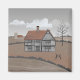 Colourful artwork of an old medieval house in the English countryside, with an old church in the background, and a couple of hares boxing in the foreground. Perfect for anyone who loves folk art.