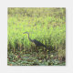 Uma fotografia de um Herão Azul Excelente caminhando através de um lago. A superfície do lago está coberta de lírios de água. A lagoa está rodeada de pedúnculos de plantas verdes, que está perto de um campo. Fotografia Copyright ©2021 Kimberly J Tilley.