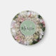 Uma mandala de ouro decorativa de hexágono dourada num pano de fundo de buquê colorido de flores brancas, amarelas e cor-de-rosa. No centro pode ser personalizado em uma esfera verde com nome, frase, letra ou logotipo.