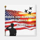 Um soldado saúda a bandeira americana com o pôr do sol refletindo através dela. Aviões sobrevoando a bandeira, e as mensagens de "Honra e Lembre-se do Corajoso" e "Dia Memorial" para homenagear os heróis mortos que serviram o país.