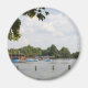 O Serpentine no Hyde Park de Londres, fotografado num ensolarado dia de verão, pessoas estão promenorizando ao longo do lago arenoso, há pedalos azuis na água, e o pavilhão pode ser visto um pouco mais adiante ao longo da costa