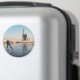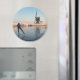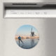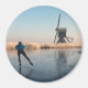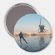 Imã fotográfico redondo com um atleta patinando em um rio congelado passado por reles de fosco-capuz e um moinho de vento em uma bela manhã de inverno nos Países Baixos.