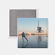 Fotoímã de Souvenir com um atleta patinando em um rio congelado passado por capas de fosco e um moinho de vento numa bela manhã de inverno nos Países Baixos.