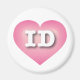 Este ímã apresenta um coração cor-de-rosa com um centro lavado em branco contendo o identificador de letras maiúsculas, brancas e em negrito, a abreviação oficial para Idaho, o estado da joia.
