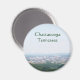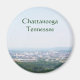 Uma vista aérea de Chattanooga, Tennessee. No topo do ímã está o nome da cidade escrito em uma fonte verde-escura.