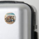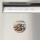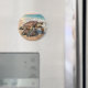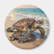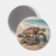 Ímã temático costeiro com uma ilustração de uma mamãe tartaruga marinha e bebê rastejando para as ondas do oceano azul em uma praia arenosa.