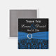Este ímã de agradecimento personalizado com cetim azul cobalto e preto tem uma fita FAUX azul e broche de joia e letras brancas brilhantes que combinam com o convite de casamento mostrado abaixo. Você também pode selecionar um formato redondo e/ou alterar o tamanho do ímã. Se precisar de outros itens correspondentes neste design, envie um e-mail para niteowlstudio@gmail.com com sua solicitação.