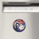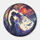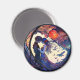 Um ímã que apresenta um desenho de vitral de um casal e lua.