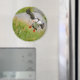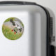 Imã fotográfico redondo com uma ave de sopro atlântica voando com asas espalhadas antes de aterrar na ilha de Runde na costa atlântica da Noruega.