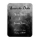 Um ímã de casamento gótico personalizado com um script vintage Salvar a Data, uma carta branca para a noiva e o noivo e cartas de cinza para a data e a localização, contra um céu assombrado com uma lua de cheio, ravens e um céu nublado em preto, branco e cinza.