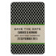 Quatrefoil Chic Elegante e moderno Salve o Magnet Premium Date com um fundo de padrão mórcico de tendência, um papel vintage com o olhar de fundo e um par de listras verdes finas. Esta imã salve a data de na moda é fácil de personalizar com seus detalhes de casamento. Clique em "Personalizar" para encontrar mais opções de personalização.