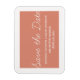 Imã salve a data branca em laranja e branco com design de tipografia de guião simples e divertida. Esta imã salve a data de tendências é fácil de personalizar com seus detalhes de casamento. Para obter mais opções de personalização, clique no botão Personalizar Ti.