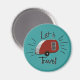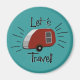 O design retrô deste ímã lembra os anúncios de impressão nos anos 50 e 60, com uma campista de lágrimas em vermelho e prata vintage e a frase "Vamos viagem!" Da minha imagem original criada digitalmente.