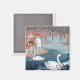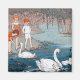 Esta imagem antiga tem um grupo de crianças alimentando lindos cisnes brancos na borda de um lago em uma floresta. A ilustração é feita em azul, laranjas e brancos. Veja minha loja Art by MAR para combinar produtos com este design.