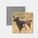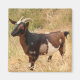 Foto de uma cabra marrom e branca parada num campo de erva, mostrando seus chifres.