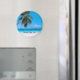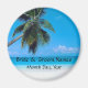Cena de praia tropical com espaço para nomes da noiva e noiva e um lugar para você se adaptar com a data do casamento.