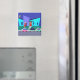 Este Retro Open House Party Magnet colocará-lo-á no clima de festa. O design de desenho mostra o exterior de uma casa moderna de meio século. Através do chão até as paredes de vidro de turquesa no teto, podemos ver as silhuetas azuis marinhos de gajos festivos. Há um casal conversando em frente a uma janela. Do lado oposto da sala, podemos ver um homem dançarino e o homem de longa-ventura que todos estão tentando evitar. O exterior da casa tem uma porta vermelha alegre e uma chaminé roxa de tijolo sobredimensionada. Uma passagem de cinza está cortando uma faixa até a porta da frente, através da grama da floresta. A cena noturna tem um céu azul escuro com uma lua amarela e crescente. Um casal atraente está fazendo o cha-cha-cha a caminho do carro. A loira está vestindo um vestido vermelho brilhante. Sua escolta bonita está vestindo um terno preto e uma gravata vermelha. As mãos dele estão envoltas na cintura da mulher. Na rua, em frente à casa, podemos ver três carros clássicos de cor brilhante. Peça hoje e festas como se fosse 1959!