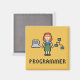 Ilustração de arte de pixel retratando um programador feminino, um computador e um fluxograma.