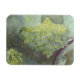 A pintura retrata um aglomerado de uvas em tons de amarelo e verde, pendurados em uma videira. As uvas aparecem em salto e translúcidas, captando luz que melhora sua aparência fresca e suculenta. As folhas em torno do aglomerado são um verde vibrante, com veias delicadas visíveis, agregando profundidade à cena. O fundo está suavemente desfocado, trazendo o foco para as uvas e dando à imagem um senso de calma e amadurecimento, como se fosse um dia quente de verão. As cores são moles, naturais, e evocam uma sensação de abundância