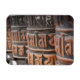Imagem fotográfica retangular com rodas budistas de bronze fechadas no templo Swayambunath em Katmandu, Nepal.
