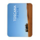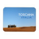 Íman retangular de um pequeno grupo de ciprestes numa pequena floresta entre as colinas barradas no outono, no Val d'Orcia, Toscana, Itália, com o texto: Toscana, Itália. Um souvenir excelente!
