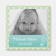Íman personalizável com informações sobre fotografia e nascimento. Bolinhas verdes e brancas