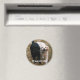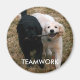 Pintura de um adorável filhote preto de laboratório e filhote de ouro durante a brincadeira, cada um com uma extremidade de um bastão grande em sua boca, correndo juntos em pura alegria, em um ímã.