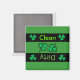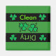 Um imã verde de máquina de lavar loiça com um trevo irlandês verde com palavras que dizem limpar e sujar faz um mago limpo de máquina de lavar loiça suja
