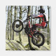 Um tiro de ação de um motociclista moderno com ambas as rodas no ar pulando sobre rochas na França. Uma foto com efeito poster.