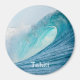 Íman redondo com uma onda de cano surfando excelente quebrando em uma grande abertura e cores turquesas no melhor lugar para surf, o Oceano Pacífico com o texto: "Taiti".