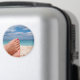 Imagem fotográfica redonda de souvenir com pés de mulher com esmalte vermelho-rosado nas unhas numa praia branca numa ilha no mar mediterrânico a relaxar durante as férias de Verão.