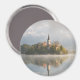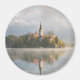 Foto redonda de um nascer do sol nebuloso no lago Bled com a ilha com igreja e névoa com reflexo na água à primeira luz do sol da manhã na Eslovênia.