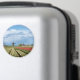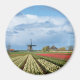 Imã fotográfico redondo com uma paisagem com moinho de vento e tulipas amarelas e vermelhas sob um céu nublado no campo holandês, num belo dia de primavera na Região do Bulb, Países Baixos.