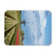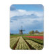 Íman de souvenir vertical com uma paisagem com moinho de vento e tulipas amarelas e vermelhas sob um céu nublado no campo neerlandês, num belo dia de primavera na Região do Bulb, Países Baixos.